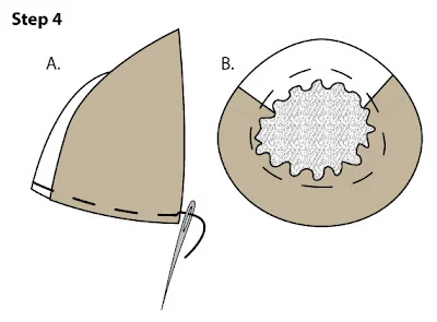 Sew a gather stitch around your base piece. Draw in your gather stitch just a little, then place your plastic base in the middle of your fabric base and draw your gathered in tight around it. Tie off your thread tightly.